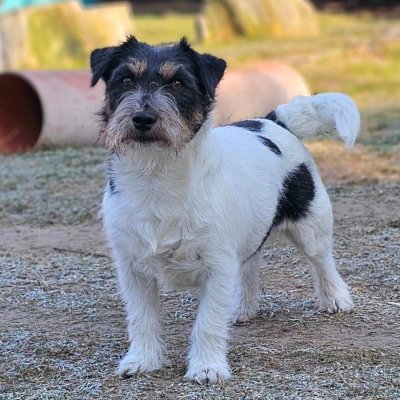 biało-brązowa, szorstka suczka, z piękną głową, harmonijnie zbudowana, wesoła i zawsze chętna do zabawy.